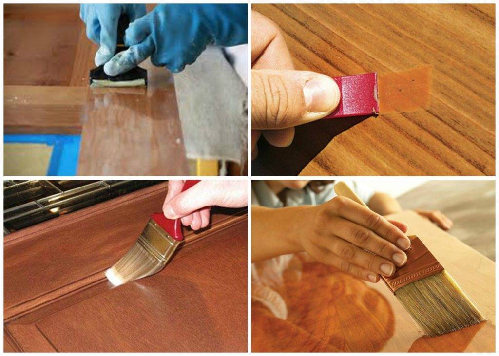 Если на поверхности находятся видимые повреждения, их следует заделать при помощи специальной шпаклевки по дереву соответствующего оттенка или горячего мебельного воска. Мелкие царапины маскируются восковым карандашом.