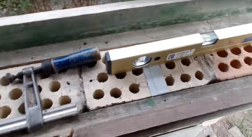 В нижней части каждого элемента проделываются два отверстия под саморезы для установки опалубки. В работе используются шурупы (допускаются б/у) и шуруповёрт. Готовая опалубка имеет следующий вид.