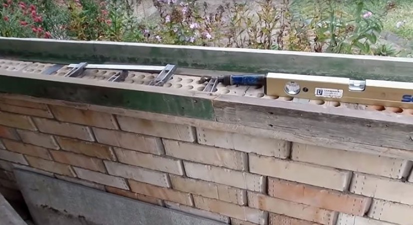 После очистки подоконной части из сетки выполняется конструкция необходимой ширины. Она нужна для качественной заливки. Складывается в два раза и крепится проволоками для надёжности. Каждый кусок проволоки опускается в кирпичное отверстие и закрепляется на сетке.