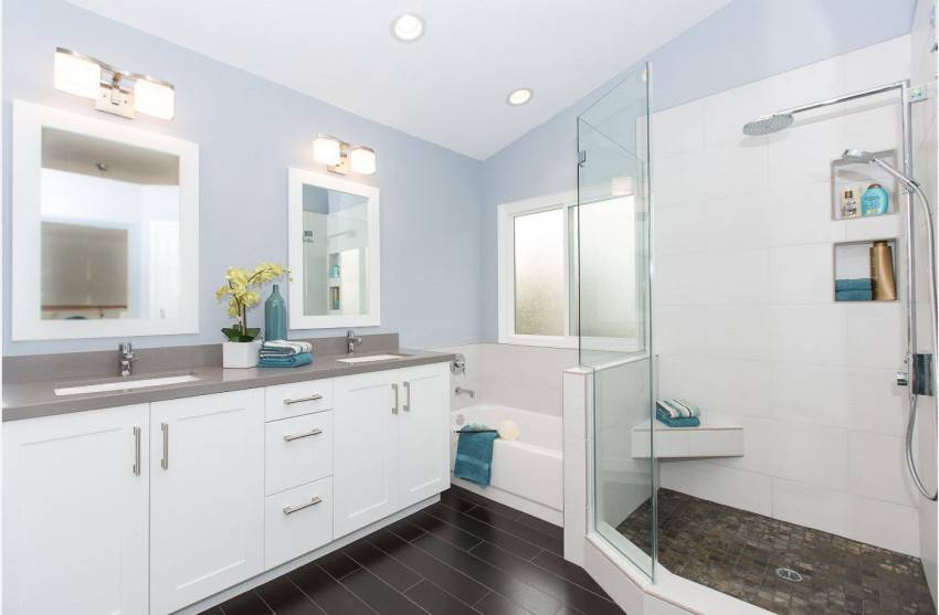 Для ванной средних размеров имеет смысл подбирать общий тон более спокойный приглушенный с добавлением ярких акцентов в виде аксессуаров.