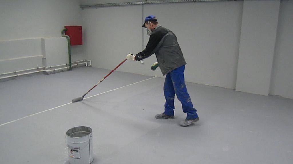 Перед нанесением краски пол промывают разбавленным водой ПВА. Второй вариант — слабый водный раствор соляной кислоты (1:9). Через сутки поверхность очищают пылесосом или мягкой щеткой. после этого бетонный пол готов к нанесению эпоксидной краски.