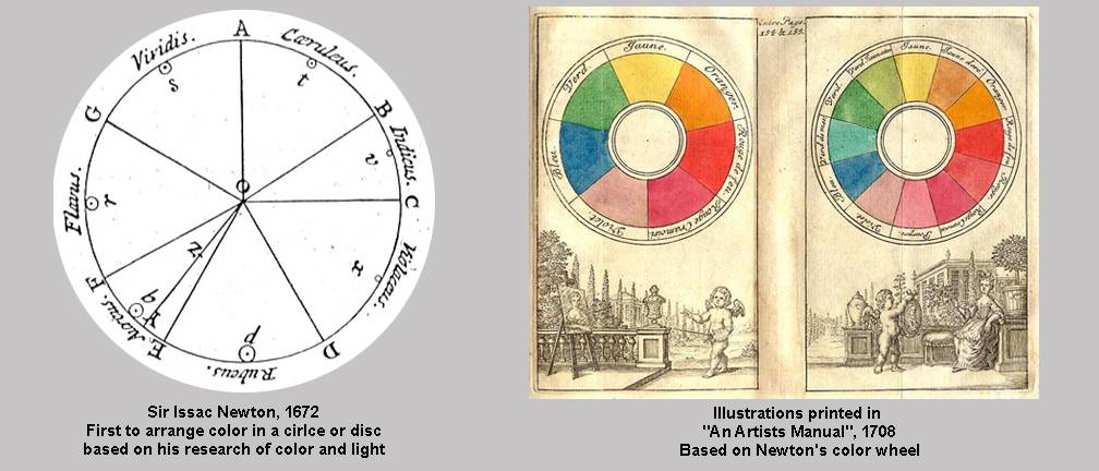 Первый цветовой круг, который приводил видимые цвета в систему, был предложен Исааком Ньютоном. Круг состоял из семи секторов с цветами: красный, оранжевый, желтый, зеленый, голубой, синий и фиолетовый.