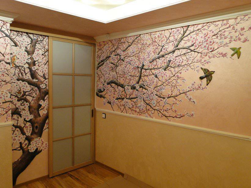 Дорого и эффектно смотрится роспись стен. Наиболее актуальными в этом направлении являются растительные и животные мотивы. Являясь комбинацией фотообоев и трафаретного узора, декор такого варианта позволяет украсить помещение и оставляет полную свободу для творчества. Нанесенный рисунок может быть как монохромным, так и цветным, единичным (на какую-то одну область) или во всю стену. Быть индивидуальным или дополнять иное дизайнерское решение.