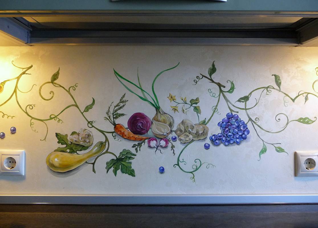 Неплохо будет, если вы изобразите на стене кухни обстановку уютного кафе или загородного пикника.