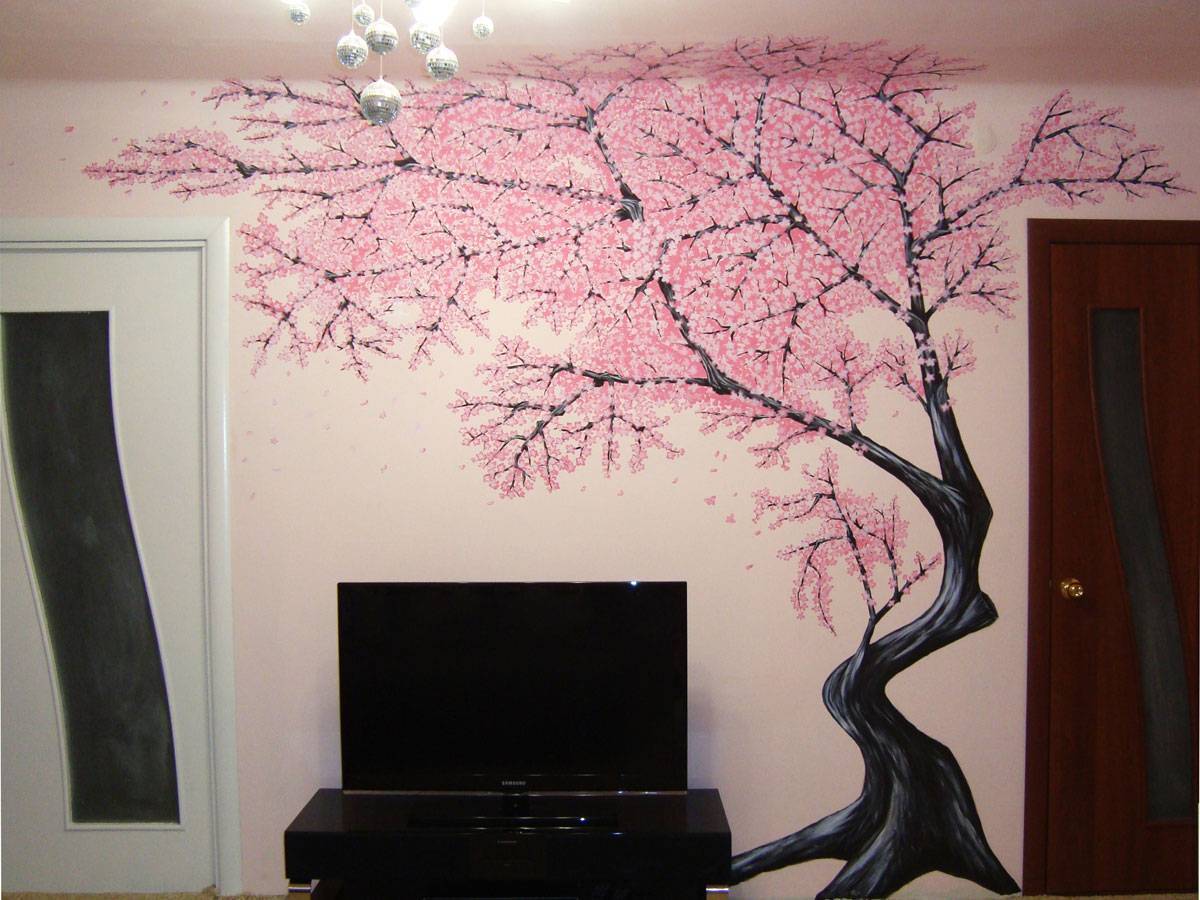 - Для гостиной – рисунок с деревом под порывом ветра, ветка цветущей сакуры, сливы, яблони.
