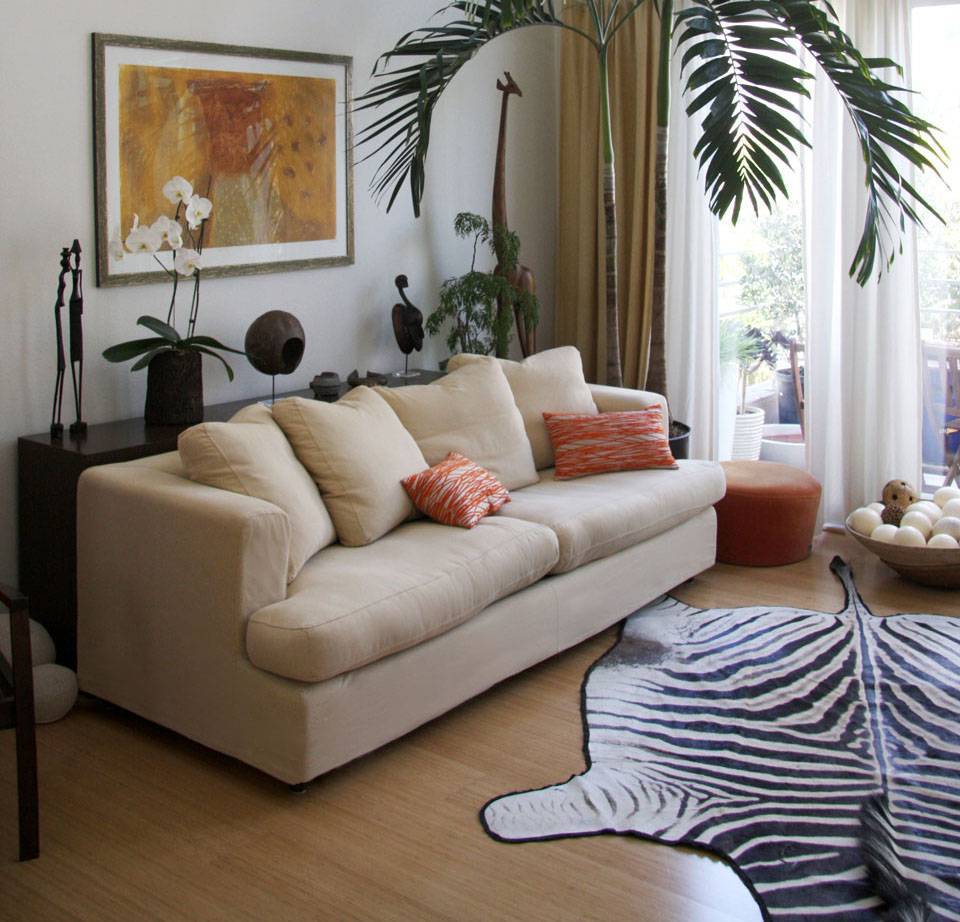 Нет возможности сменить имеющуюся мебель – накройте её соответствующими стилю пледами или покрывалами, добавьте меховых подушек, и вы мгновенно ощутите дыхание Африки.