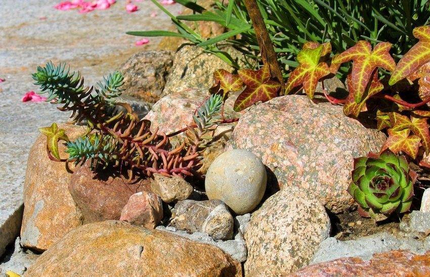 При укладке камней, важно оставлять место между ними, чтобы растениям удобно было прорастать. Между камнями можно грамотно спрятать кашпо с любимым цветком, если хотите порадовать себя им в течение лета.