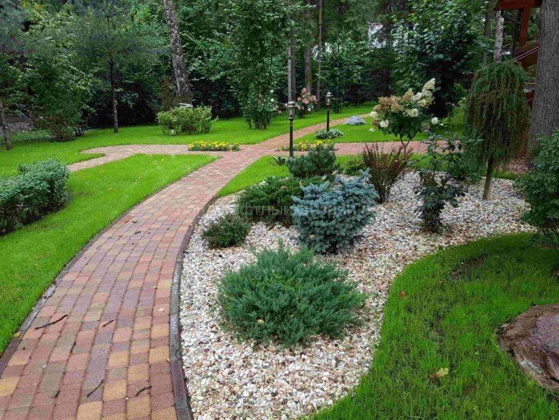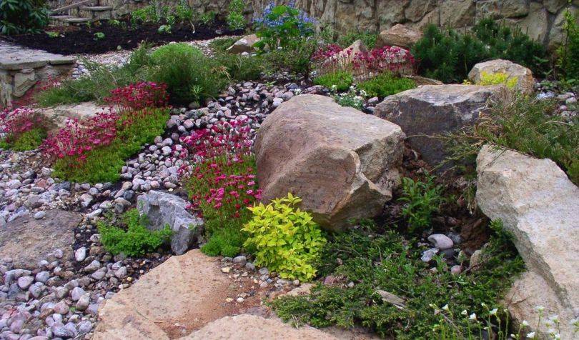 Важное условие — минимум гранита. Его серого оттенка будет не видно на тот момент, когда начнут разрастаться декоративные культуры