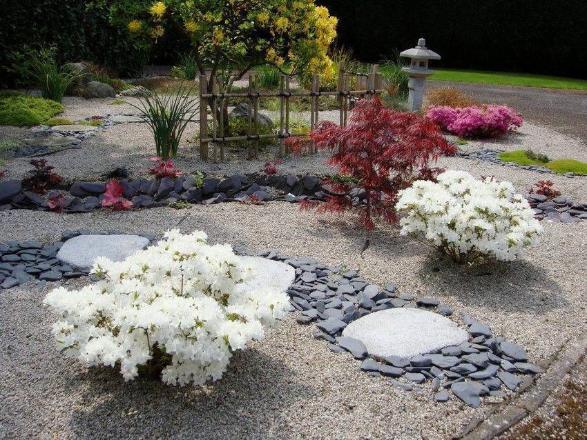 В японских вариантах особое внимание уделяется оформлению каменных строений. Из камней часто сооружают дополнительные строения