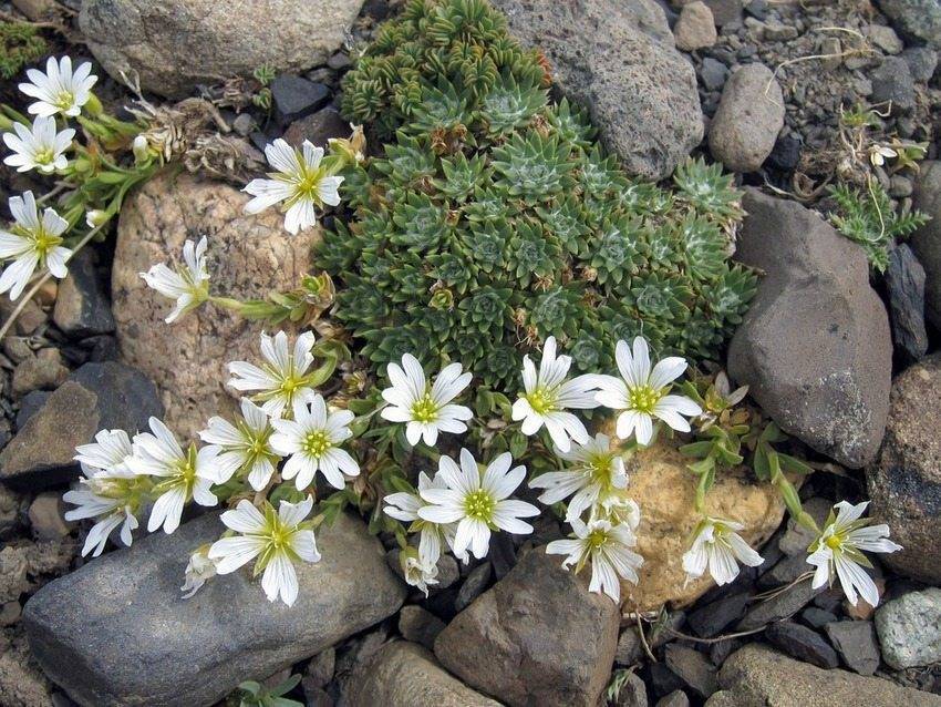 Некоторым нравится устроить из рокария сплошную каменистую насыпь. Такой «прессинг» выдержат не все растения, поэтому следует подобрать самые выносливые: камнеломки, почвопокровники, молодило.