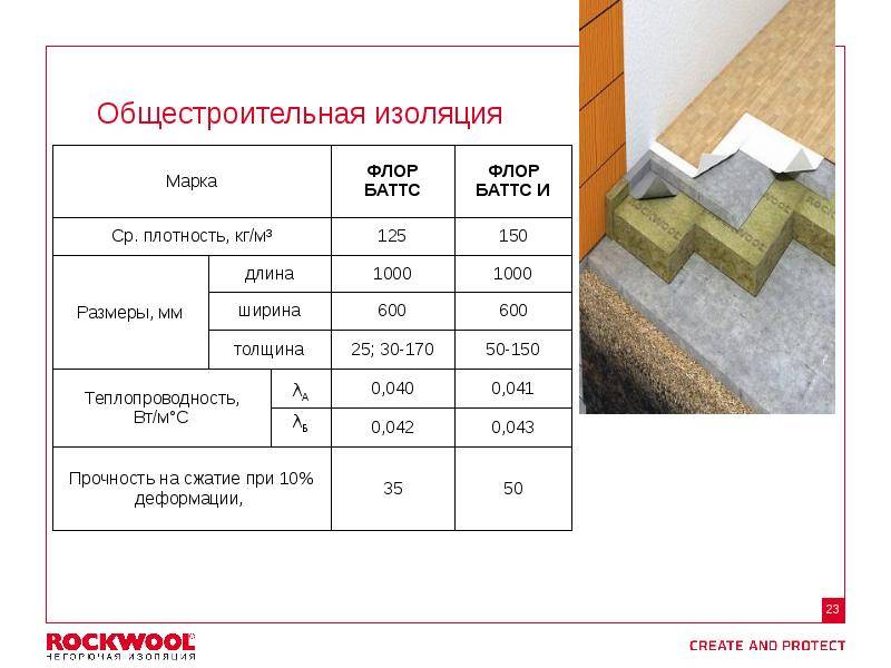 Для изоляции горизонтальных конструкций – пола и межэтажных перекрытий – применяется утеплитель Роквул Флор Баттс. Жесткие гидрофобизированные плиты имеют плотность 100-125 кг/м3. Они рассчитаны на высокую нагрузку, способствуют затуханию звука, распространяющего с соседних этажей.