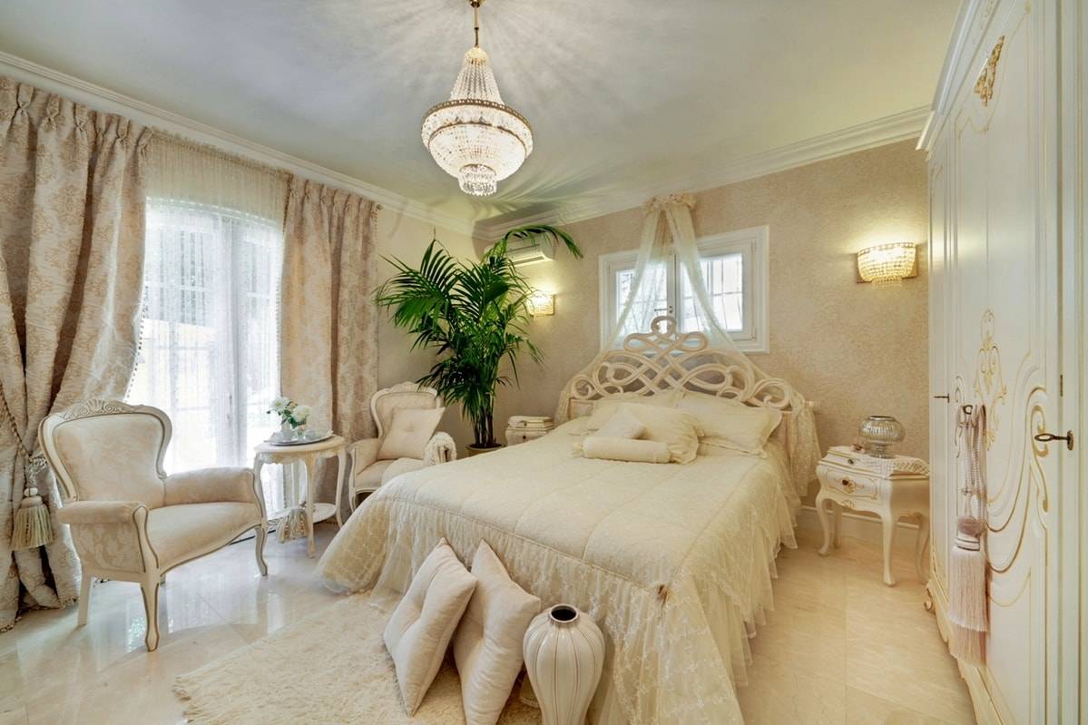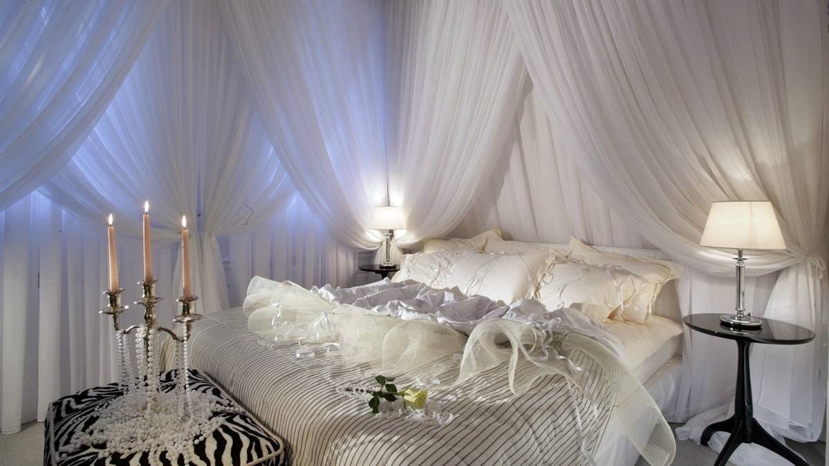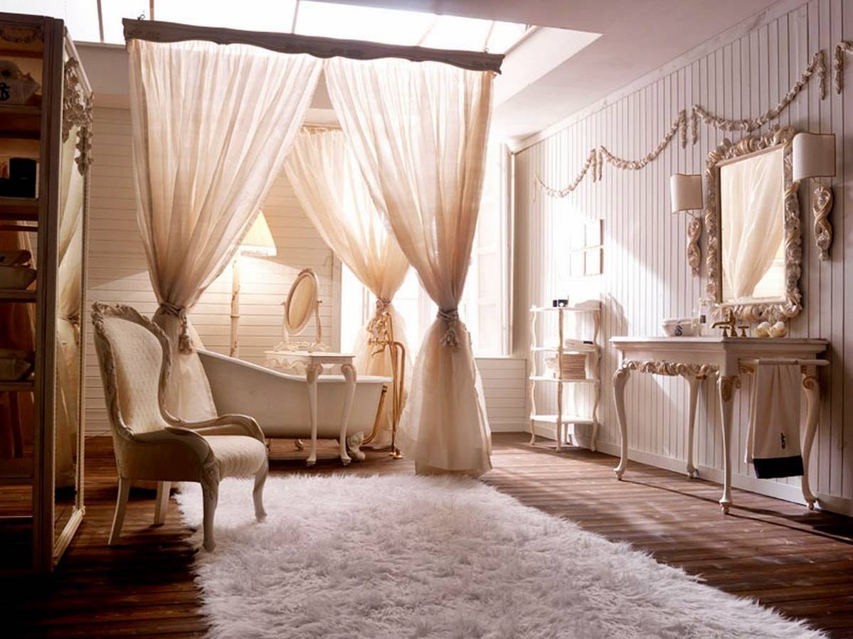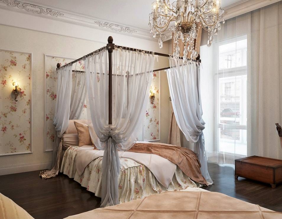 Центральное место в любой спальне занимает кровать, и в этом современные квартиры вполне отвечают средневековым представлениям. Постель в интерьере квартиры в романском стиле должна быть большой, массивной и надежной, желательно с каркасом из дерева и хлопковым балдахином, как на фото ниже. В изголовье можно поставить имитацию старинного сундука, который заменит банкетку. Фоном для такой меблировки послужит пестрый восточный ковер на полу из деревянных панелей и оштукатуренные или окрашенные в бежевый, кремовый, нейтральный светлый оттенок стены.