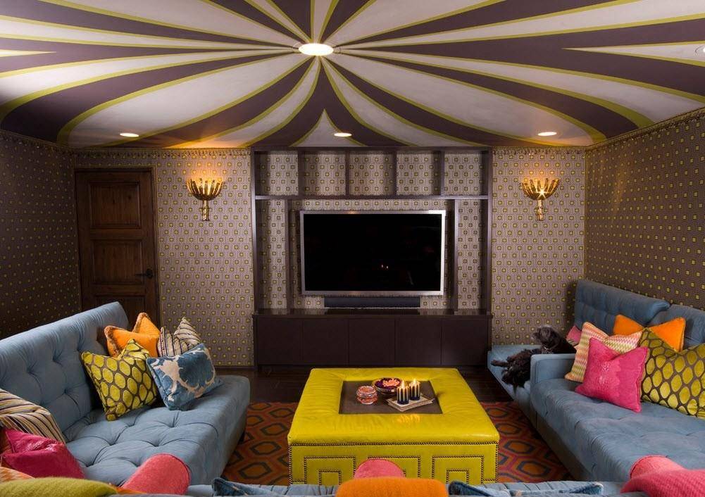 Восточный интерьер отличается плавными, мягкими формами с нанесенной на них росписью. Потолок может быть подвесным, иметь несколько уровней, популярно использование декоративных накладок с разнообразной имитацией.
