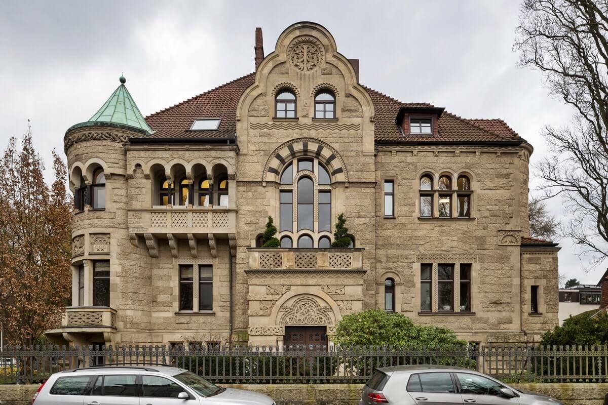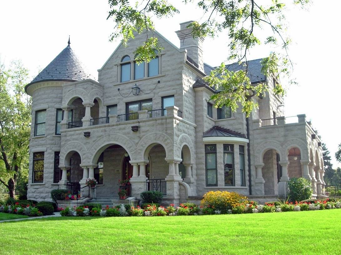 Характерными признаками стиля можно считать округлые сегменты (апсиды) и башни с переходами. Последние могут играть роль балконов, или выполнять исключительно декоративные функции. Эффектное дополнение к экстерьеру здания – каменные парапеты с равномерным чередованием высокой и низкой кладки.