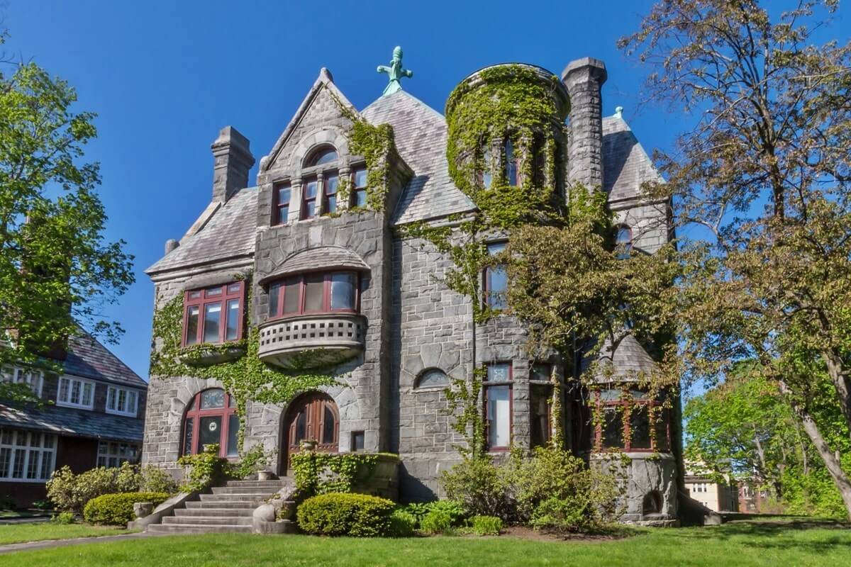 Дома-замки, выполненные в романском стиле, обычно имеют не менее двух этажей, не считая цокольного. Стены всегда толстые, массивные. Всё сооружение кажется собранным из разных геометрических объёмов. Веранда, гараж и другие необходимые постройки сооружаются вплотную к дому, являясь его неотъемлемыми частями.