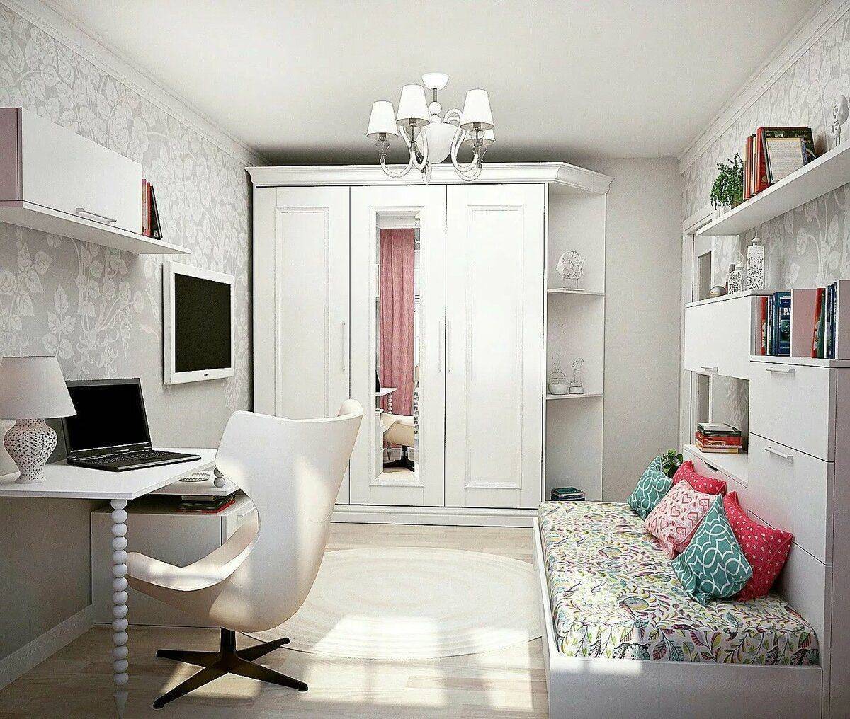 Спальня для девушки: кровать, туалетный столик, шкаф, аксессуары