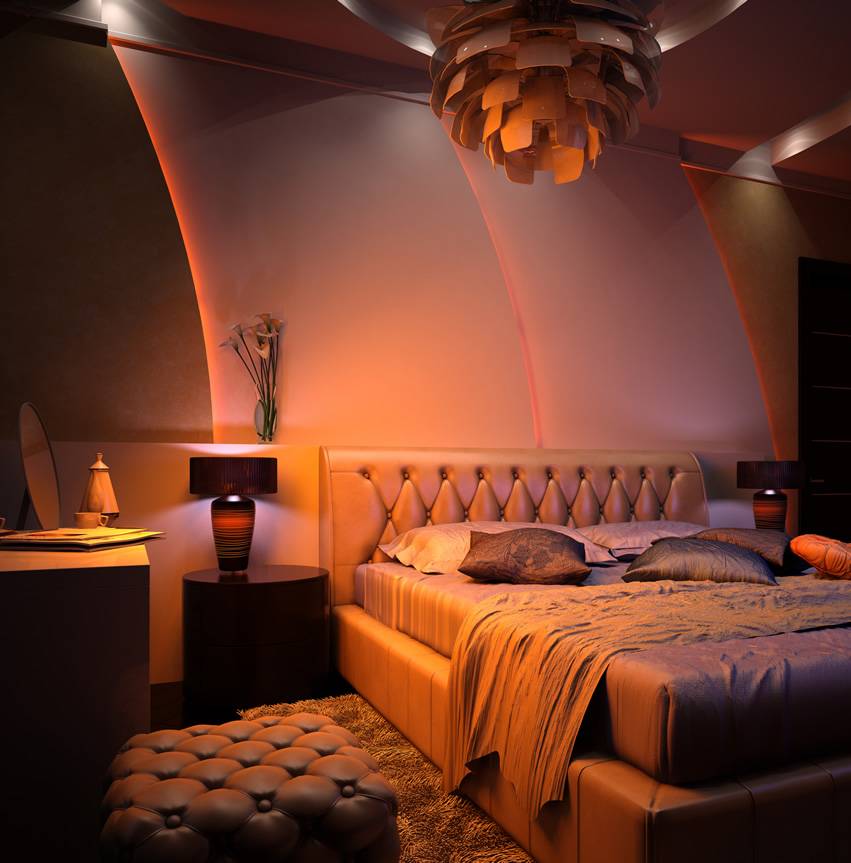 Свет — волшебный инструмент для создания нужного настроения в доме. Забудьте на этот вечер про потолочные светильники, пусть сегодня правят приглушенные бра, ночники, торшеры и светодиодные ленты. Можно зажечь сразу множество источников света, но приглушить их яркость диммером, отвернуть к стене или заслонить чем-нибудь полупрозрачным. И не забудьте про свечи! Они один из самых романтичных аксессуаров.