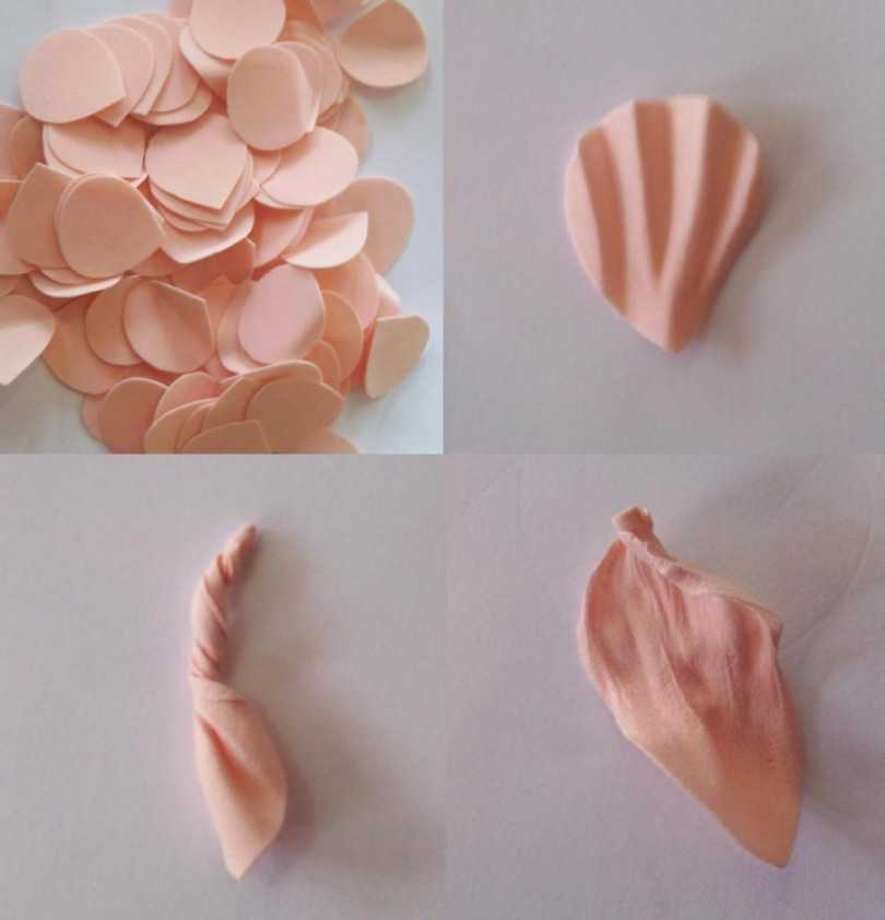 Финальным этапом будет изготовление листьев. Их вырезают из зеленого материала, придавая ту форму, которая естественна для данного типа цветов. При их изготовлении можно использовать молды – они позволят создать рельеф на поверхности листьев и придать им реалистичности.
