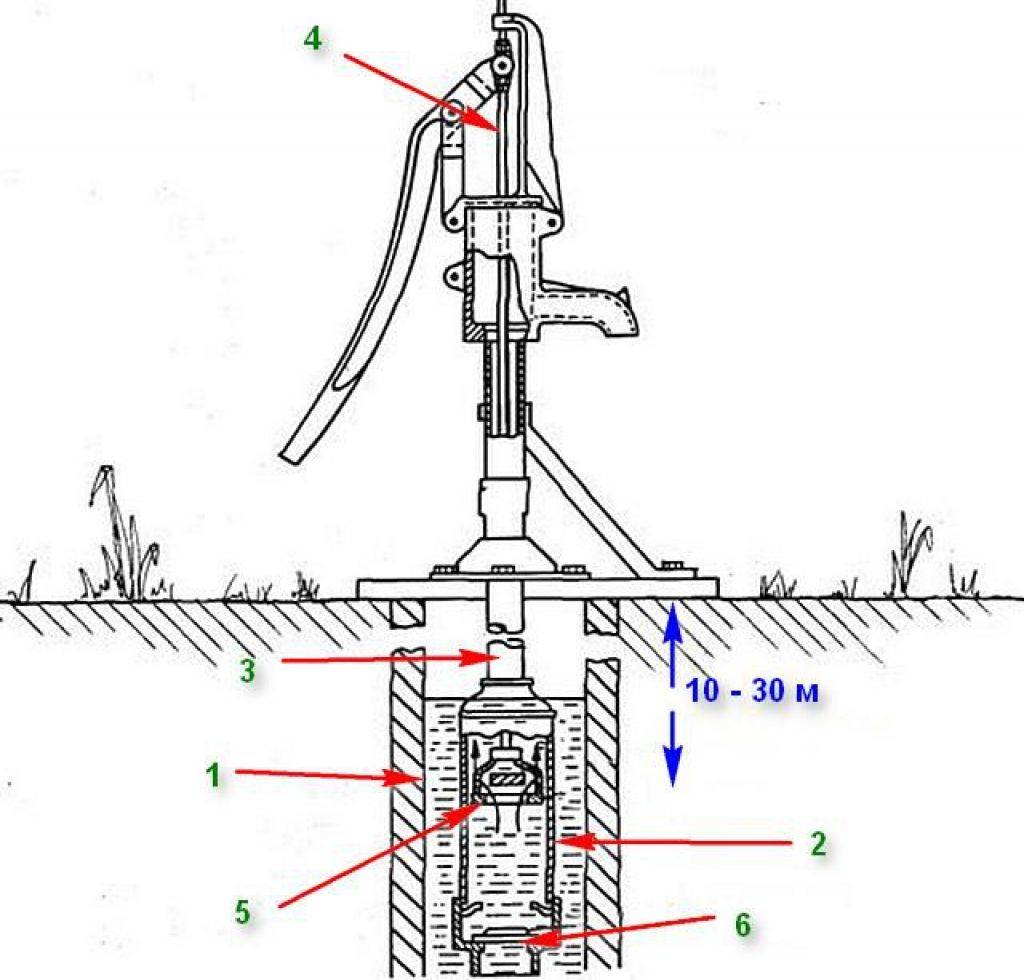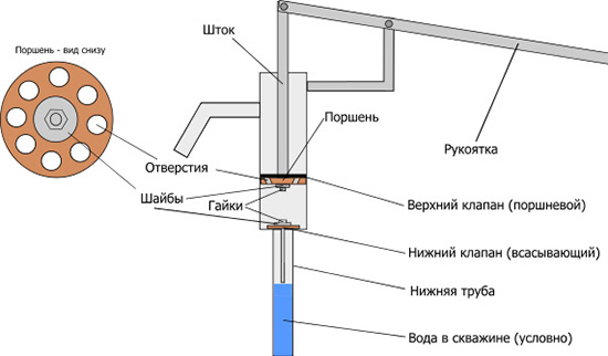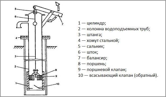 Чтобы понять по какому принципу работает ручной насос, надо разобраться с его конструкцией. Ее можно условно разделить на подземную и надземную часть:
