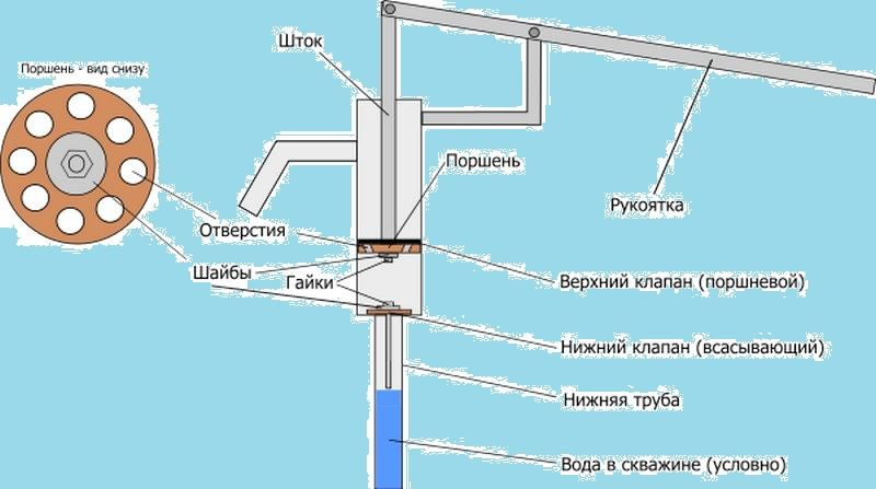 Самым распространенным устройством для ручного забора воды из скважины является поршневой насос. Такие конструкции можно наблюдать во многих частных дворах и на дачных участках. Они отличаются разнообразным исполнением надземной части, но устройство механизма и принцип работы одинаков.