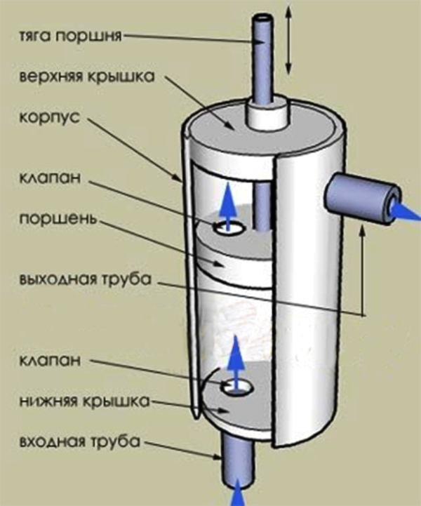 - Одновременно с поднятием поршня под ним внутри цилиндра создается разрежение. Оно открывает обратный клапан, всасывая новую порцию воды.