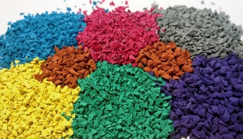 Измельченная резиновая крошка. Этот основной компонент покрытий получают путем переработки бывших в употреблении автомобильных покрышек. Для изготовления резинового пола гранулированный компонент переплавляется и соединяется со связующими компонентами (например, смолами) и модификаторами. Зачастую покрытие из этого переработанного продукта характеризуется лучшими свойствами по сравнению с материалом, изготовленным из исходного сырья.