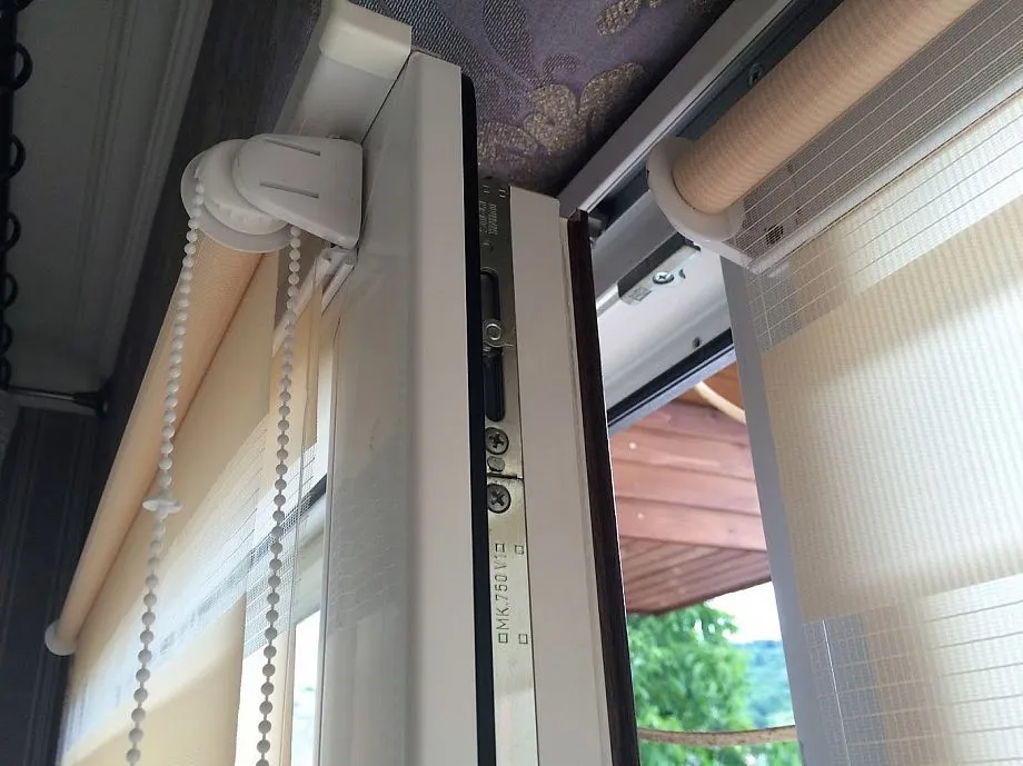 Чтобы не повреждать раму окна, штору можно смонтировать с помощью пластиковых или алюминиевых кронштейнов.