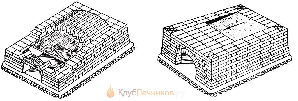 Когда пройден этап подготовки, приступают непосредственно к строительству. Вначале выкладывается фундамент, затем подпечек. После чего выстраивается под и свод печи.