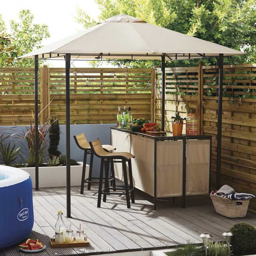 По сути конструкция представляет собой навес. Состоит из дощатого настила в качестве пола, четырёх опор с перекрытиями по периметру и крыши. Украсить сооружение можно декоративными арками или озеленением: разросшаяся лиана будет надёжно скрывать отдыхающих от солнца, и создавать ощущение уютного убежища.
