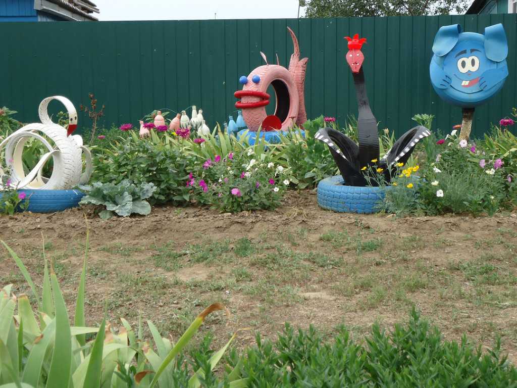 - Животные. Вкапывают в землю две маленькие шины горизонтально. На них вертикально устанавливают одну большую и сверху еще одну поменьше: туловище и голова