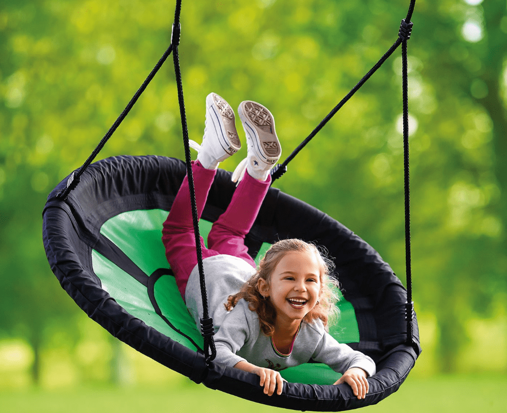 - Качели. Сначала колесо разукрашивают и прибивают к дну дощечку, чтобы закрыть отверстие. Затем его подвешивают к дереву на цепи или веревки