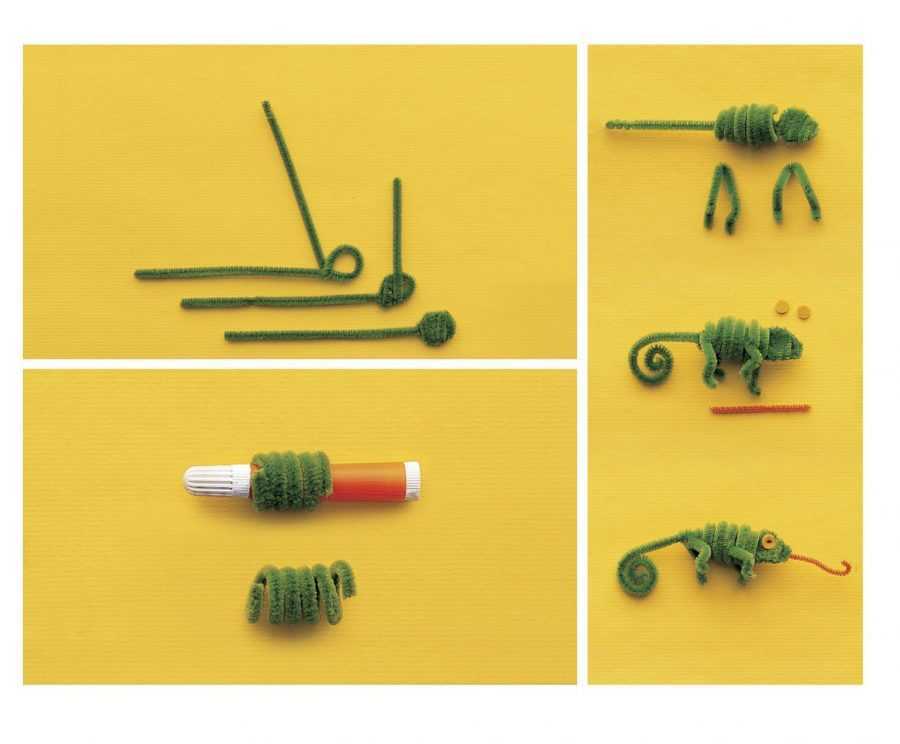 Преимущество синельной проволоки в том, что даже самые простые конструкции приобретают необычный и замысловатый вид. Хамелеон будет сделан из нескольких частей, одной из которых является голова.
