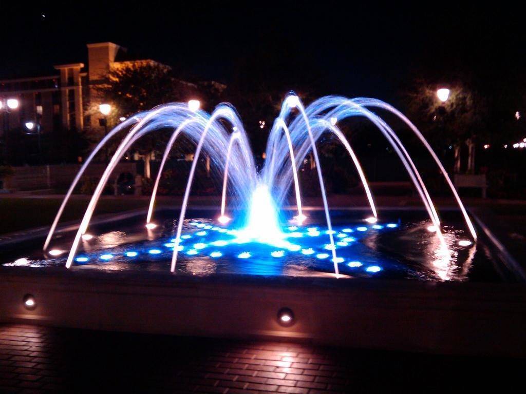 Подсветка. Особенно популярна и актуальна в последнее время светодинамическая разновидность светильников. Они пульсируют либо меняют цвет сообразно движению струй. Такой вариант часто используют в декоре городских, садовых и парковых фонтанов.