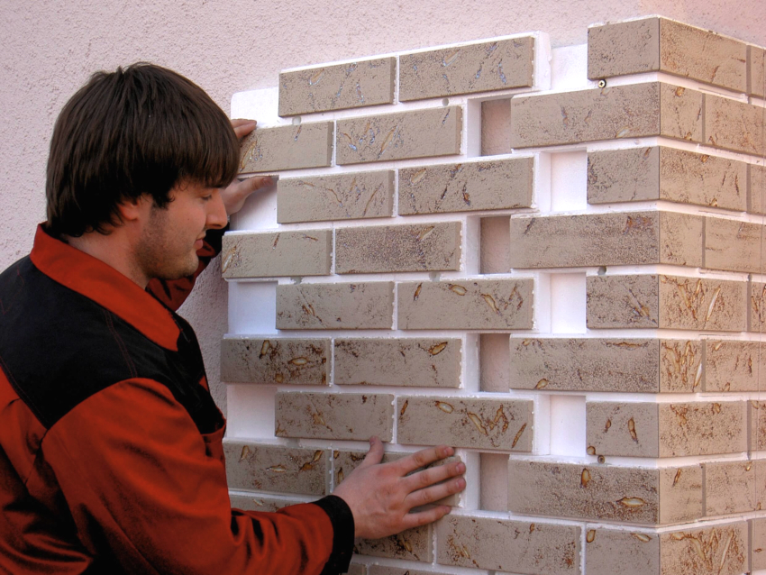 Если требуется выполнить утепленный фасад, следует начать работу с укладки теплоизоляционного слоя, для которого рекомендуется приобретать стройматериалы правильных геометрических форм. Наиболее популярными вариантами считаются пенопласт, пенополистирол и минеральная вата. Какой бы ни была надежной клеящая смесь, для лучшего сцепления нужно закрепить утеплитель при помощи дюбелей-зонтиков, отличающихся большой круглой шляпкой. В целом отделка стен под кирпич с утеплением фасада состоит из таких этапов: