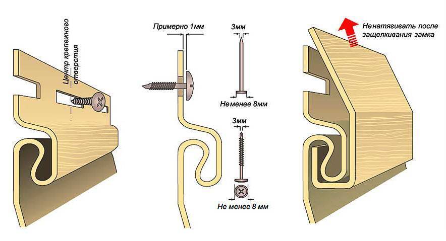 Саморез или гвоздь устанавливается через каждые 300-400 мм, обязательно в центр отверстия. Увеличение расстояния крепления может способствовать провисанию сайдинга и ухудшению внешнего вида фасада.