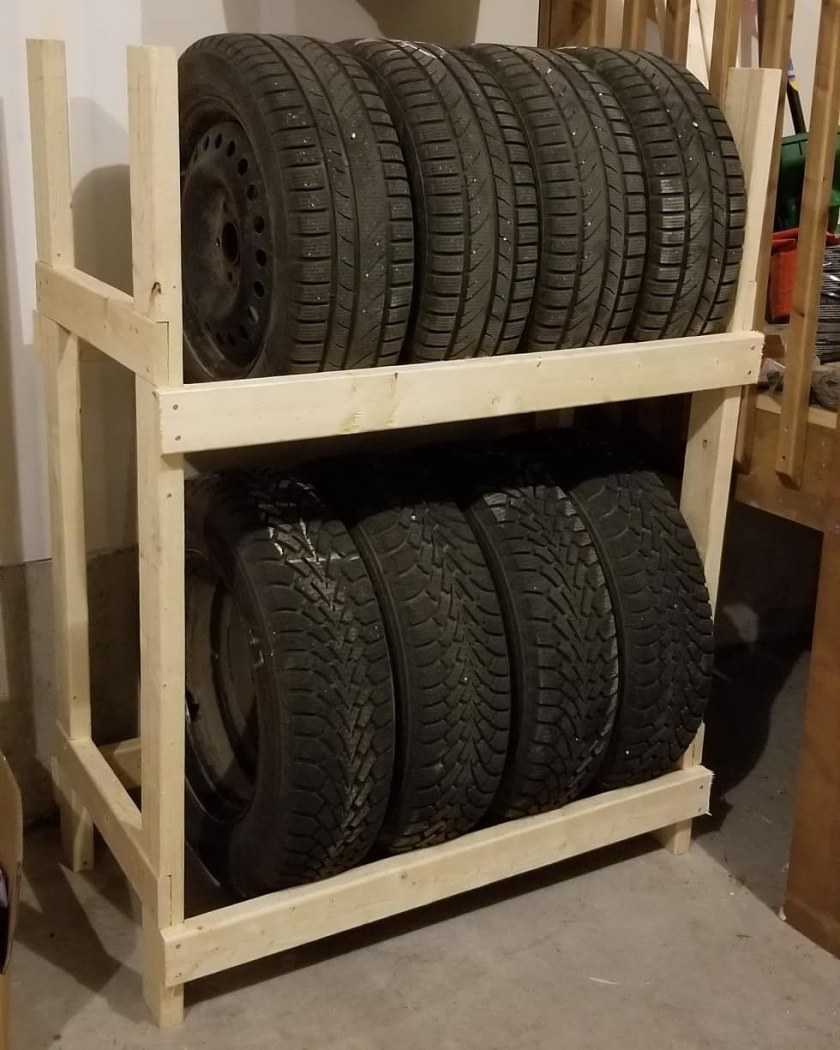 Место для хранения «лежачих» или «стоячих» шин можно оборудовать под потолком или на одной из полок стеллажа или под его нижней полкой. Потолочный стеллаж для шин можно собрать из профилей и уголков – понадобится лишь дрель и «болгарка», а при наличии сварочного аппарата его можно сварить.