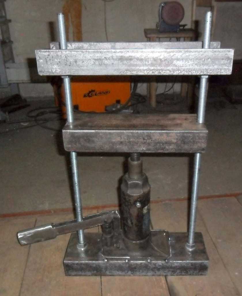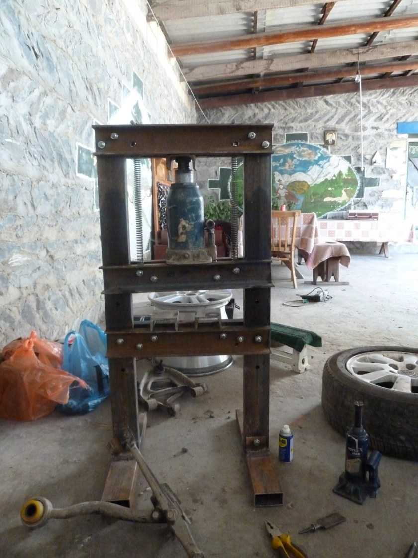Такое самодельное приспособление в гараже — мечта любого автомобилиста. С его помощью обрабатывают разнообразные изделия и материалы, принцип действия в силе давления. Оборудование такого типа состоит из цилиндров, на нём обрабатывают рихтовкой изогнутые или мятые детали, а также соединения элементов. На прессе можно гнуть листовой металл или спрессовывать плотный картон. Для домашнего использования достаточно небольшой производительности. В качестве основного элемента конструкции используется маленькая хитрость — используют бутылочный домкрат с насосом.