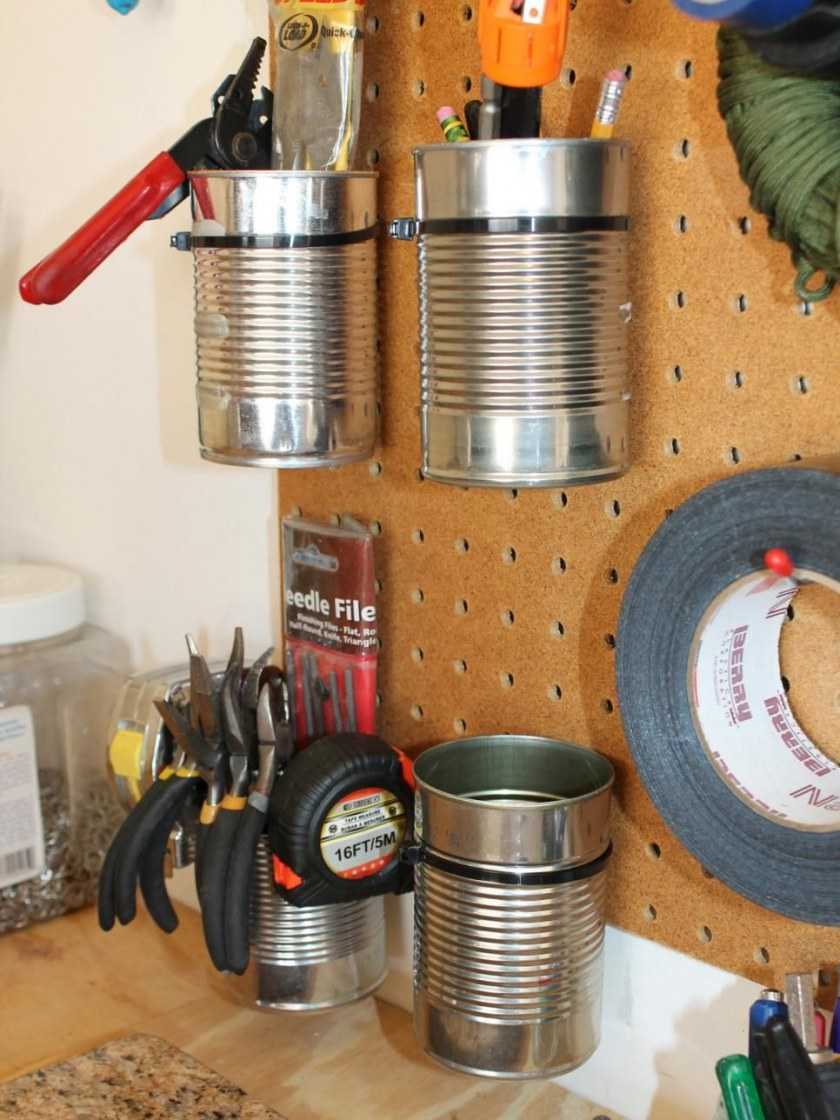 При тотальном дефиците денег или из любви к искусству, вы можете сделать и оригинальную систему хранения, использовав старые пустые канистры. Их у любого автомобилиста за год скапливается достаточно много, а если попросить у товарищей-соседей, то хватит на каждый отсек такого интересного шкафчика. Конечно, ничего сложного тут нет и для выполнения подобных самоделок для гаража своими руками видео-уроки вовсе не нужны. Вам необходимо взять пластмассовую канистру, хорошо ее вымыть, чтобы не оставалось следов ее содержимого. Вооружившись ножницами по металлу, ножом или другим инструментом, срезаем переднюю крышку с канистры, но так, чтобы оставались бортики, и содержимое не переваливалось через край. Чтобы конструкция была более устойчивая, вы можете закрепить ее на задней стене при помощи саморезов, но загонять их будем, конечно, не в стену, а в деревянную рейку, которую прикрепляем на дюбели.