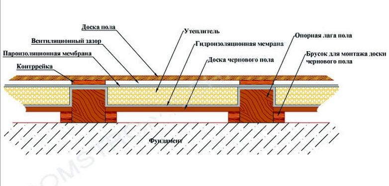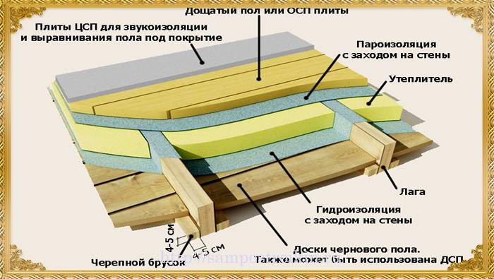 Сверху утеплитель закрывается слоем мембранного паробарьера и затем поверх лаг крепят финишный пол.