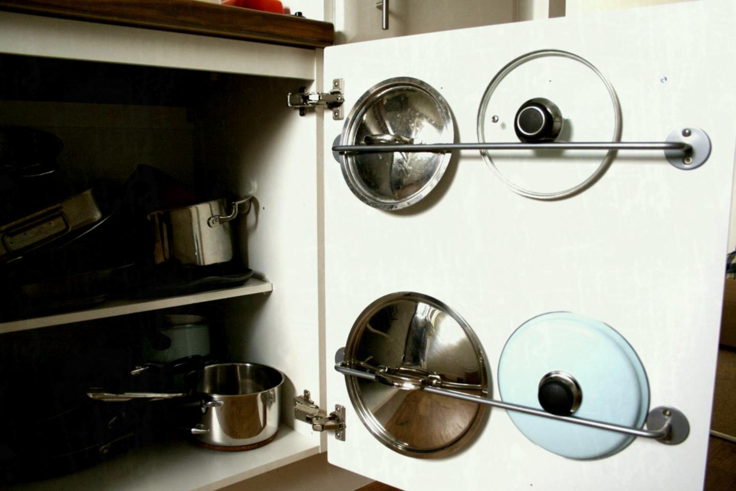 как хранить крышки от кастрюль и сковородок внутри кухонного шкафа: