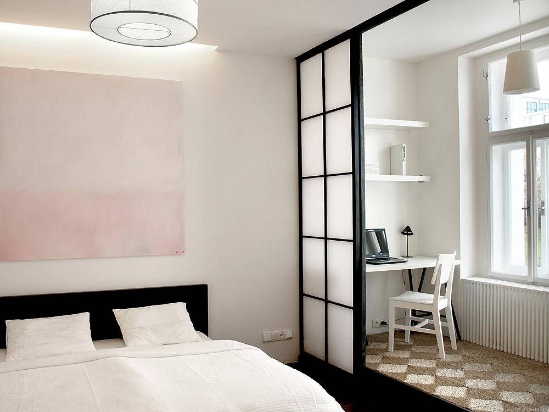 - Если у вас в распоряжении маленькая комната, площадью менее чем 12 кв. м, то рекомендуется использовать способ зонирования пространства цветом. Вариантов выполнения этой идеи масса. Например, рабочую зону можно покрасить в более темный цвет, нежели зону спальни. Интерьер смотрится очень мило и комфортно. Гармоничней всего выглядит помещение с разделкой пропорций 1:2. Но именно вам уже решать, сколько места выделить для кабинета, а сколько для спальной зоны.