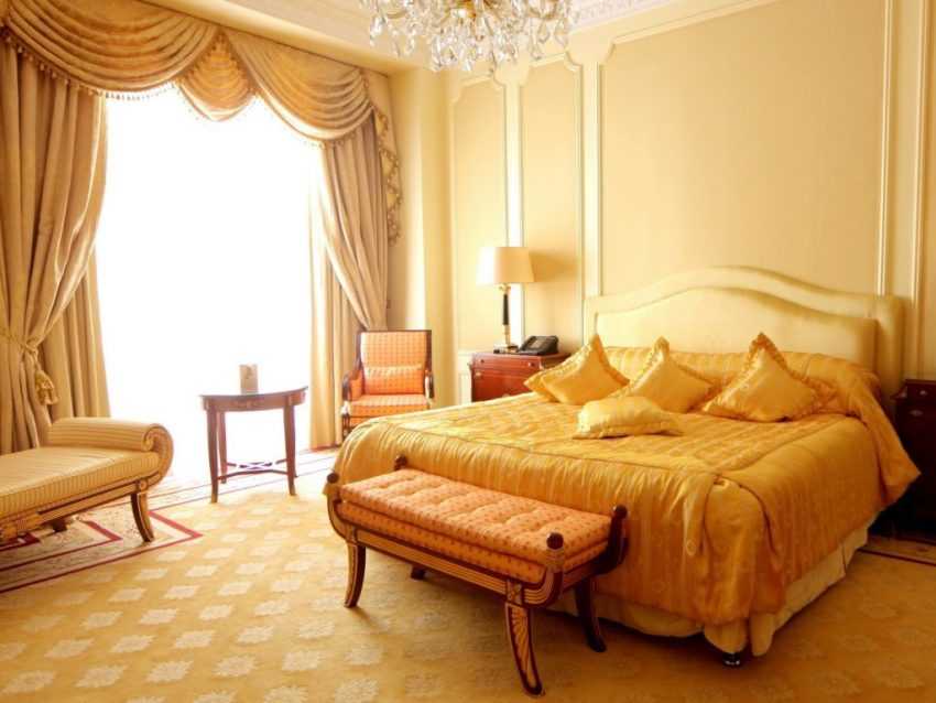 В описываемом пространстве располагают практически любые предметы. Чаще всего сюда ставят кровать или диван, шкаф, стол, пару кресел с журнальным столиком, а также легкий туалетный столик с зеркалом во всю стену.