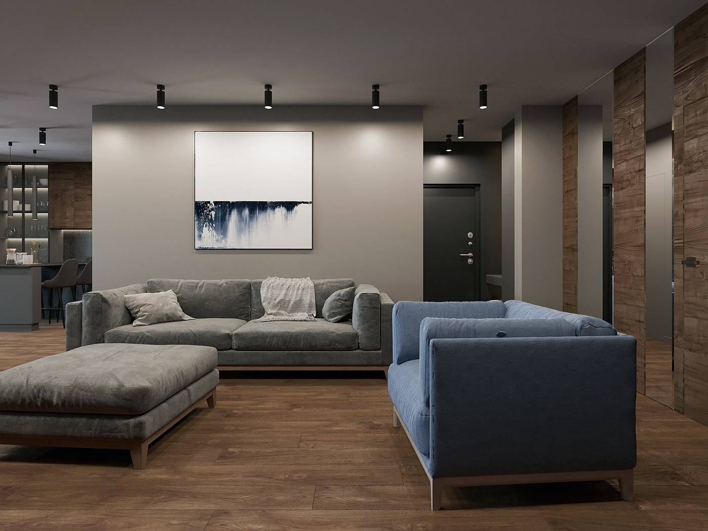 В современной комнате с белыми стенами и потолком будет интересно смотреться ламинат оттенка крем-брюле. Одно из перекрытий отделайте светлыми деревянными панелями и повесьте на них телевизор. Разместите напротив техники серый низкий диван и синие стулья-кресла. Завершите интерьер синими подушками, аналогичным напольным ковром и пастельными римскими шторами на окнах.