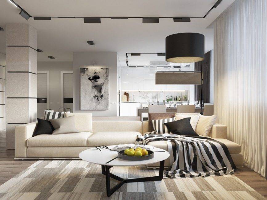 Зонирование в комнате выполнено при помощи барной стойки, отделяющей кухонное пространство, а центром гостевой зоны становится широкий угловой диван. Уют помещению придают оригинальные системы искусственного освещения.