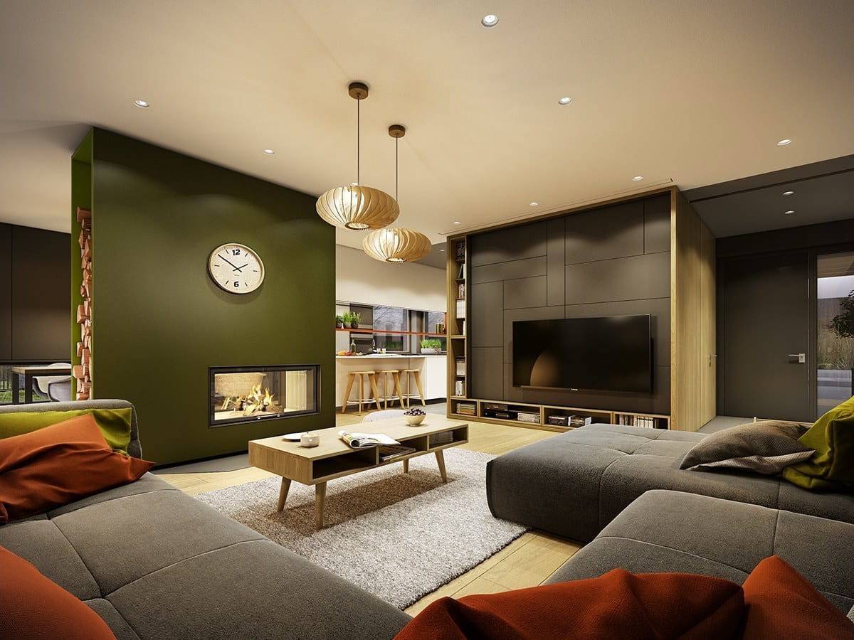 Уютную атмосферу поможет создать камин, он может располагаться как в центре комнаты, так и в любой из его зон.