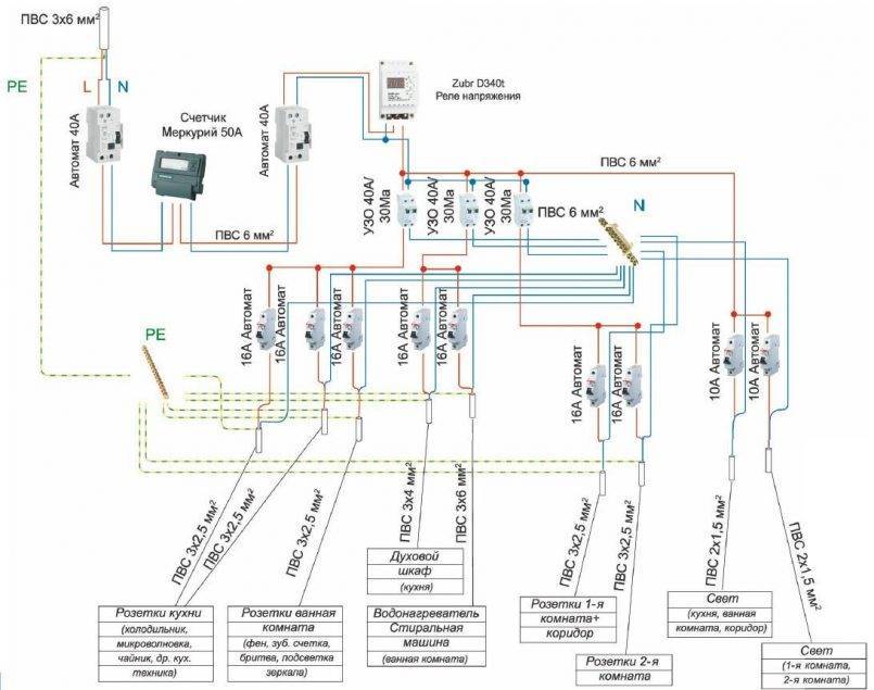Несмотря на относительно невысокие требования к бытовому электромонтажу, по сравнению с промышленным вариантом, принцип распределения энергии остаётся незыблемым. То есть каждая группа потребления выстраивается отдельным сегментом общей сети.