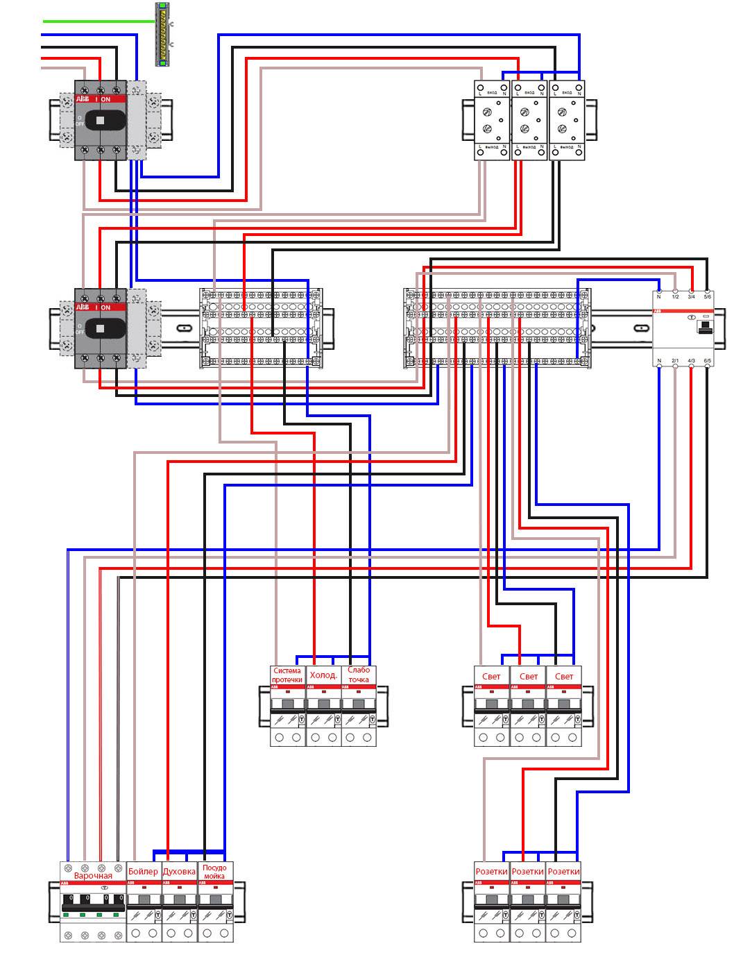 Порядок подключений, а также коммутация, при которой вся схема электрощита видна наглядно без дополнительных рисунков