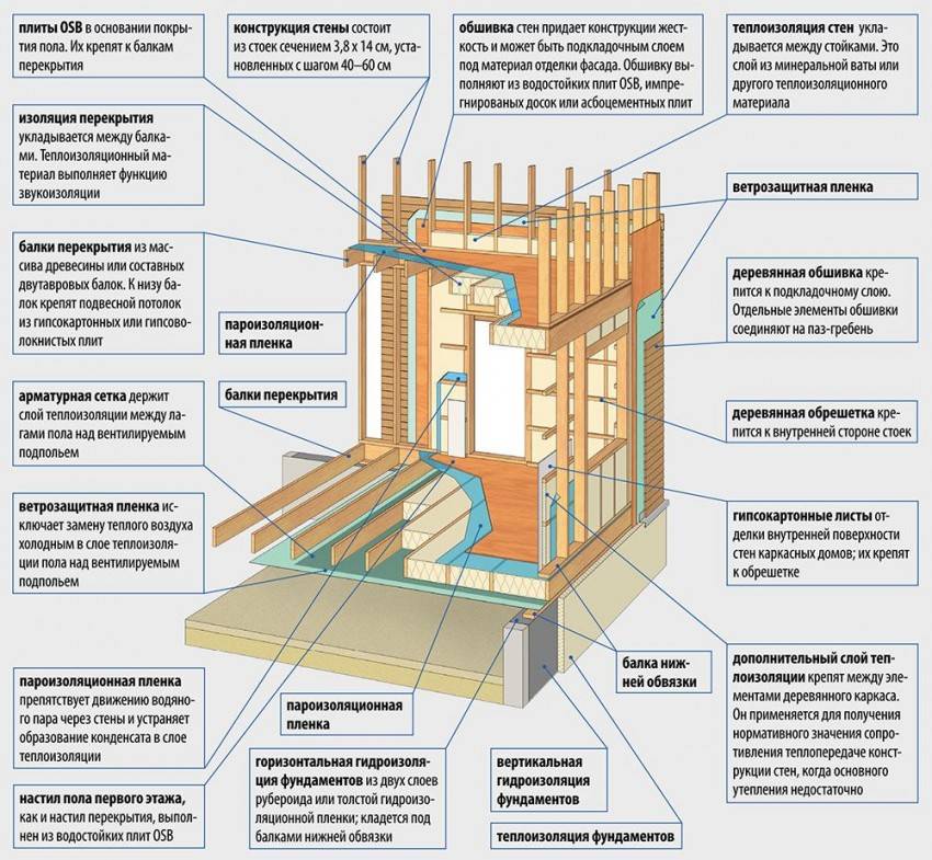 Самые лучшие материалы для домов – это брус, выполненный из клееного шпона. Конструкционно стены деревянного каркасного дома состоят из следующих элементов: