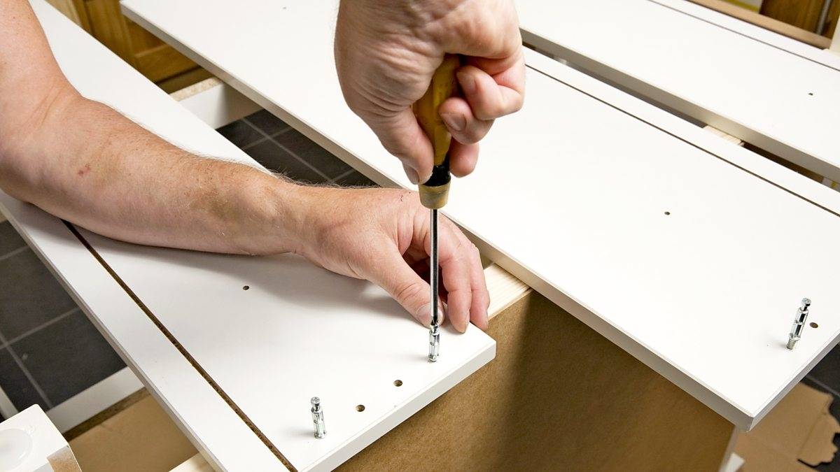Любая инструкция о том, как собрать шкафы-купе самому, вычислить расположение деталей, начинается с подготовки прочного ровного основания, то есть дна будущего шкафа. Эту составную часть часто называют цоколем, закрепляют с помощью специальных крепежных элементов — конфирматов или еврошурупов.