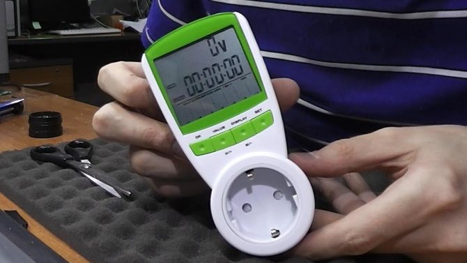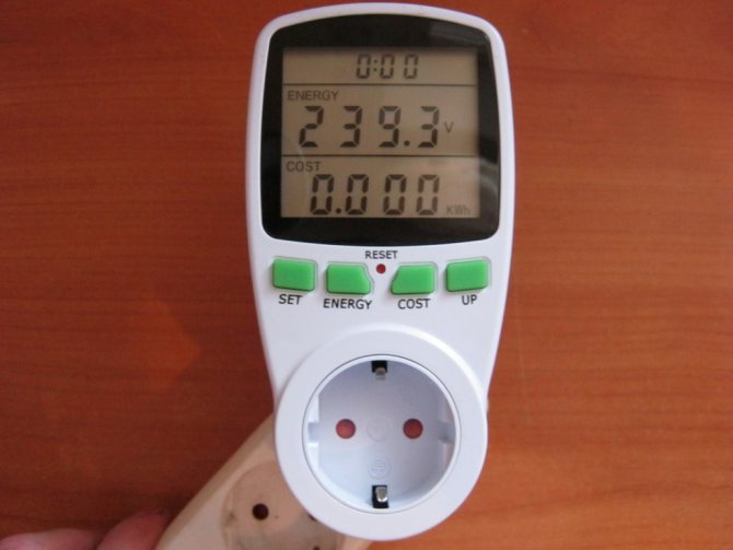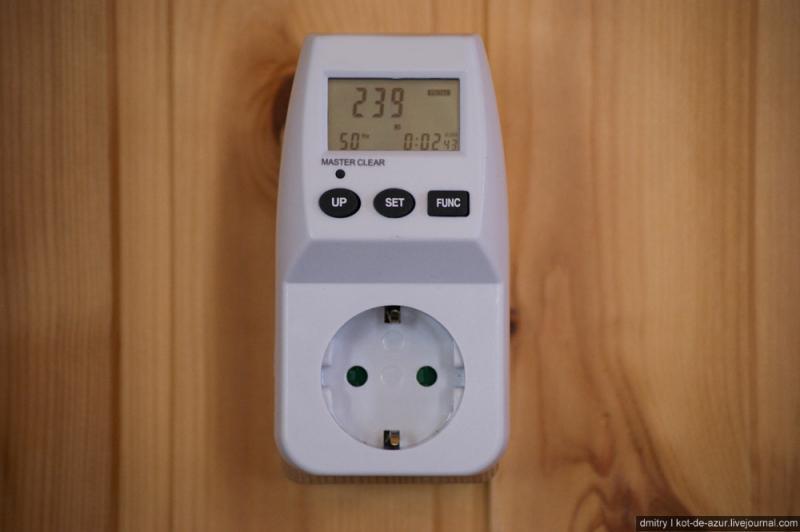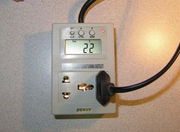 Важно приобрести прибор, который можно включить непосредственно в гнездо. Если подключать устройство в розетку, оно показывает, сколько ватт потребляют приборы. Устройство состоит из следующих составляющих: